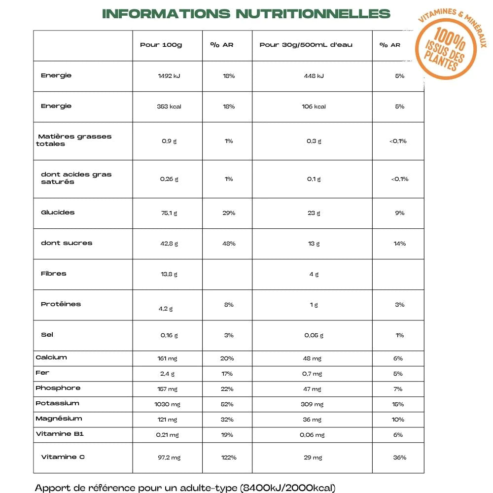 Elle vous accompagnera durant vos efforts physiques d’endurance et assurera une bonne récupération avec son apport en minéraux qui compensera les pertes en électrolytes.