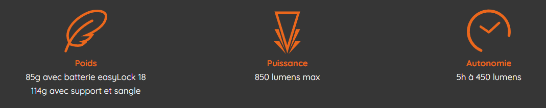 Livrée avec une pochette de rangement, une batterie easyLock 18, un câble de recharge, un support en alu easyLock 18 et une sangle frontale.