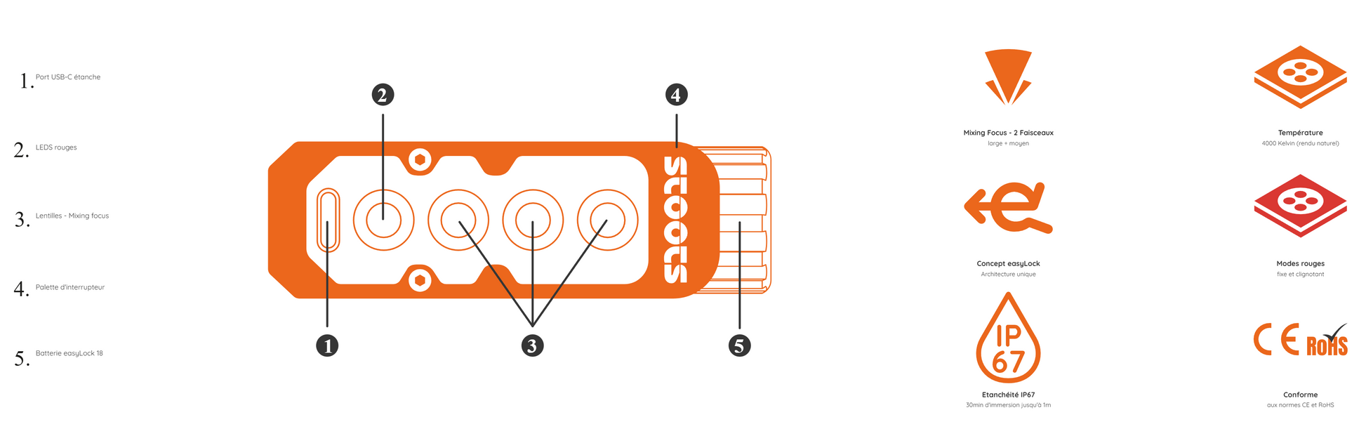 - La dernière lentille du bloc lumineux permet de gérer la LED Rouge servant de témoin du niveau de charge de la batterie. Cette LED Rouge peut également être éclairée en mode rouge fixe à faible puissance et en mode clignotant. Elle est idéale en refuge pour ne pas déranger les autres ou encore en extérieur pour ne pas perturber la faune. Le mode rouge clignotant vous permet de vous rendre visible dans toutes situations.