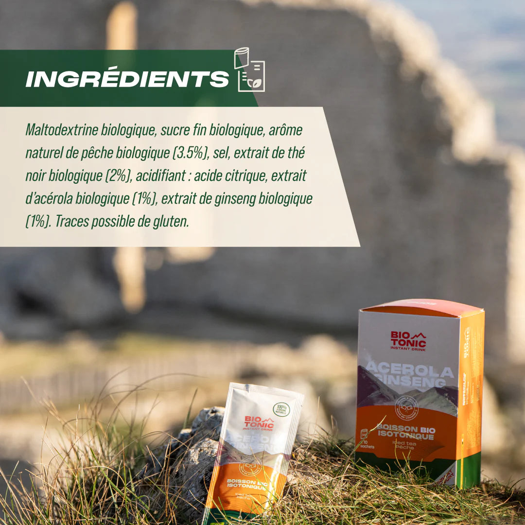 Ingrédients : Maltodextrine biologique, sucre fin biologique, arôme naturel de pêche biologique (3,5%), sel, extrait de thé noir biologique (2%)acidifiant : acide citrique, extrait d’acérola biologique (1%), extrait de ginseng biologique (1%). Traces possible de gluten.