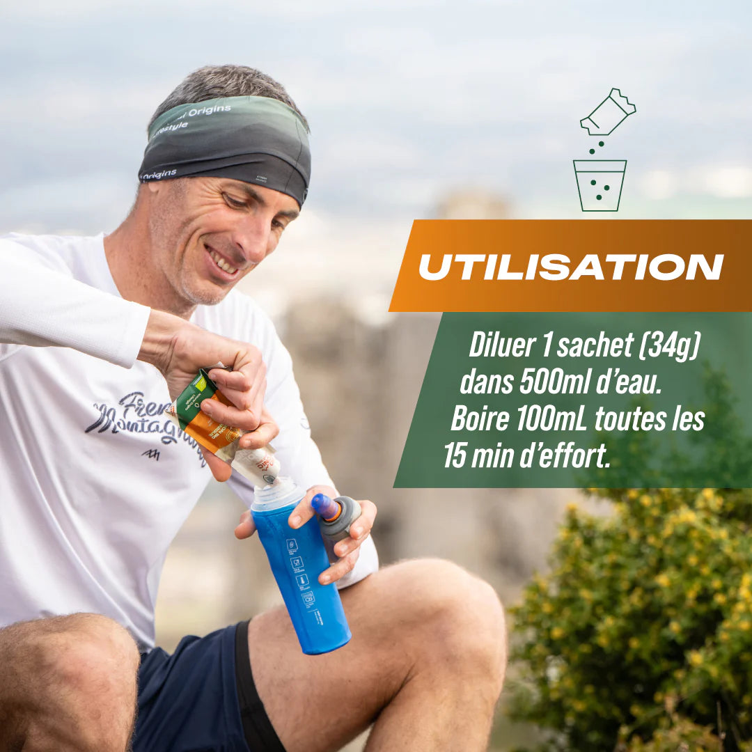 Utilisation : Diluer 1 sachet (30g) dans 500ml d’eau. Boire 100mL toutes les 15 min d’effort.